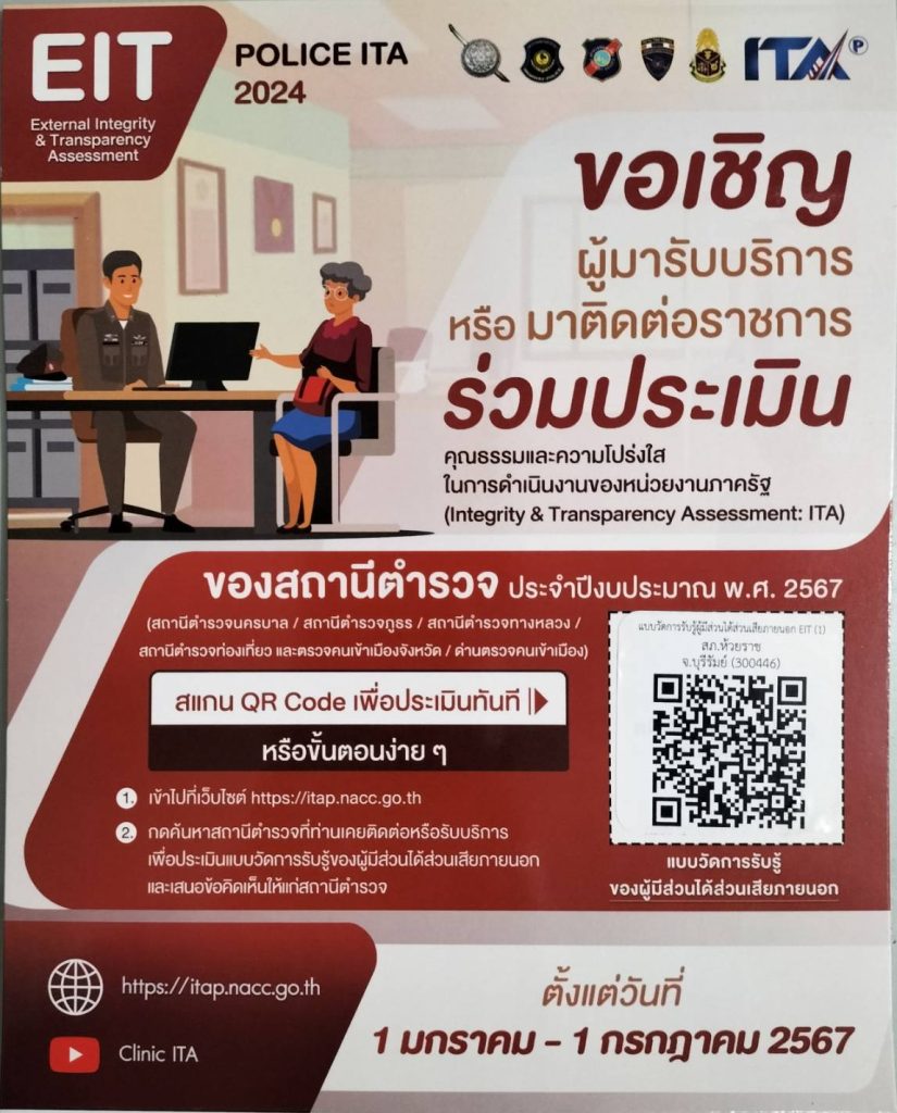 สถานีตำรวจภูธรห้วยราช จังหวัดบุรีรัมย์ จัดทำป้ายประชาสัมพันธ์และเชิญชวนผู้มารับบริการ/มาติดต่อ สถานีตำรวจ ร่วมจัดทำแบบการรับรู้ของผู้มีส่วนได้เสียภายนอก (Enternal Integrity Transparency Assesment : EIT) 2025 สำหรับนำไปพัฒนาปรับปรุงการให้บริการของสถานีตำรวจ โดยการสแกน QR Code ซึ่งได้ประชาสัมพันธ์ไว้ที่หน้าเว็บไซต์หลักของ สภ.